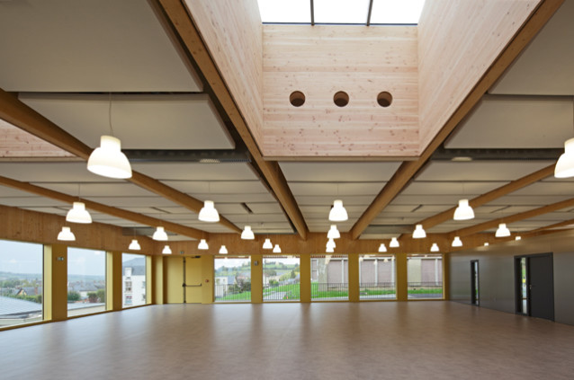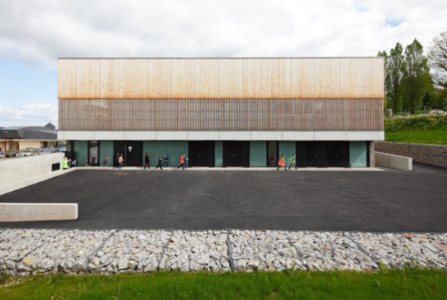 Comme une invitation à la contemplation de la campagne qui se déroule à ses pieds, le pôle de restauration de ce collège épouse le dénivelé naturel du terrain pour former le nouveau signal d’entrée de l’établissement. Dans la salle à manger, le plafond abaissé, la structure en bois huilé du KLH et l’omniprésence des baies vitrées sérénisent l’ambiance tout en cadrant immédiatement le regard vers l’extérieur. Tandis que le personnel jouit d’une salle de repos et d’une terrasse protégée des regards par un claustra de bois, le pôle technique de cuisine et de service est dissimulé à l’arrière du bâtiment. À l’extérieur, à la façon d’une icône de joaillier, le bâtiment superpose quatre anneaux : un socle brut en gabion, un anneau lisse en béton sur lequel repose le bandeau vitré, lui-même surmonté d’une couronne de bois clair. Une esthétique du bijou, encore renforcée par l’utilisation de menuiseries dorées.